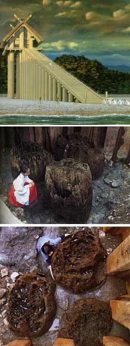 | 『日本書紀』に天日隅アメノヒスミノ宮、『出雲風土記』には天日栖アメノヒスミノ宮、所造天下大神之アメノシタツクラシシオオカミノ宮として登場しています。 『延喜式』神名帳には杵築キズキ大社とみえ、長くこの名で呼ばれていました。明治4年(1871)に出雲大社と改称されました。 創祀は、『古事記』や『日本書紀』などによると、大国主神は須佐之男尊の子(6世の孫)で、葦原中つ国の国造りにあたり、やがて天孫瓊瓊杵ニニギ尊の降臨のとき、国土を譲って出雲国多芸志の浜に身を隠しました。 大国主神の国譲りを喜んだ天照大神は、天日隅宮を建て、その子の天穂日命を祖とする出雲国造家が、連綿として祭祀を継承しています。 『延喜式』に名神大社として唯一大社に列し、出雲国一ノ宮として朝廷の崇敬が厚く、貞観9年(867)に正二位の神階を受けて、鎌倉中期以降には12郷7浦の広大な社領を有していました。現在の本殿は大社造りの名で呼ばれ、伊勢神宮の神明造りとともに古典的神社建築様式を伝え国宝に指定されています。 境内は、約16万u、本殿を中心に、拝殿、東西十九社、宝物館、摂社8社、末社3社などが配されています。 祭礼は、5月14日からの大祭礼をはじめ、神在祭、古伝新嘗祭など年間72におよび、古代以来の祭儀を伝え行っています。 社伝によると出雲大社の本殿の高さは、上古32丈(96m)、中古16丈(48m)であったと 記しています。江戸中期造営の現在の本殿は8丈(24m)であります。96mの社殿は建築上不可能で、48mにも疑問符が付けられていました。ところが平成12年4月、境内の発掘調査の結果、巨大な柱が発見されました。これが出雲国造千家家に伝わる「金輪御造営差図」にある、3本の巨大な杉を鉄の輪で引き締めて柱とした宇豆柱(棟持柱)であることが判明しました。また、同年10月には、同じ構造を持つ柱(心御柱と南東側柱)がさらに二ヶ所から発見されました。それにより48mの巨大神殿の存在 が浮上しました。 平安時代の漢詩人・源為憲の漢字研究書『口遊クチズサミ』に「雲大・和二・京三」とあり、その注釈に巨大建造物は出雲大社が第一で、二番は奈良東大寺大仏殿、それに次ぐのが京都御所の大極殿とあります。15丈の大仏殿より高いのなら、16丈=48mの本殿は現実味を感じます。 |