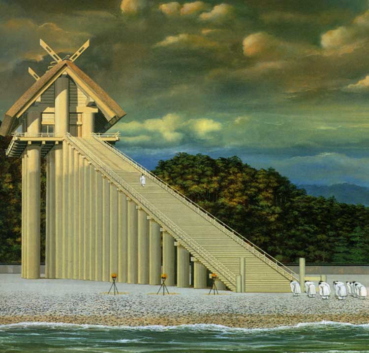 | オオクニヌシは、御大ミホの前に行っているコトシロヌシに相談をしなければならないというと、アメノトリフネが船で迎えに行き、つれて帰ってきました。 コトシロヌシは、今はこれまでと、「この国は、アマテラスの御子に奉りなさい」といって、その船を踏み傾け、天逆手をうって、これを青い生け垣のようにとりかこませて、その中に引き込んでしまいました。(美保関町の美保神社の祭神は事代主神です)。 オオクニヌシのもう一人の子タケミナカタ(建御名方)は、国譲りの話を聞くと、千引石を軽く両手で差し上げて、「誰ぞわが国に来て、忍び忍び如此物カクモノ言ふ。然らば力競為む」と、いってタケミカヅチの手をとると、その手はたちどころに氷柱となり、また白刃となりました。 こんどはタケミカヅチがタケミナカタの手をとり、まるで若い葦をつかむように、つかみひしぎて投げ捨てました。 そこで、タケミナカタは逃げますが、のがさじとタケミカヅチは信濃の州羽海(諏訪湖)まで追いつめ、捕まえて殺そうとしたとき、タケミナカタは、「恐カシコし、我をな殺したまひそ。此の地を除きては、他処に行かじ。亦我が父大国主神の命に違はじ。八重事代主神の言に違はじ。此の葦原中国は、天神御子アマカミノミコの命の随献マニマニタテマツらむ」と、いって帰順を誓いました。 州羽海でタケミナカタを屈服させたタケミカヅチは、出雲に帰ってきて、オオクニヌシにあなたの二人の息子は服従させたが、「汝が心奈何にぞ」とつめ寄ります。 オオクニヌシは、国土は献上するから、天神の子が住む御殿と同じようなものをつくってほしい、と答え、幽冥の世界に隠れ去りました。 それで、多芸志タカシの小浜に、神殿がつくられました。それは、 「底津石根ソコツイワネに、宮柱ふとしり、高天原に、氷木ヒギたかしりて、……」という、きわめて大きな木造の建物でありました。『日本書紀』も、 「千尋の栲綱タクヅヌを以て結ひて、百八十級モモムスビアマリヤソムスビにせん、その宮を造る制ノリは、柱は即ち高く太く、板は即ち広く厚くせん。とつたえました。」これが出雲大社の起源であります。 『古事記』や『日本書紀』に記されているオオクニヌシは、特定の神ではなく、国家意識が生まれたときに、国の主≠ニして観念されてきた神で、その国の主≠ニしての大国主と、出雲のオオナムチ神や三輪山のオオモノヌシ神が同一視された結果、今日の神名の形になってきました。 |